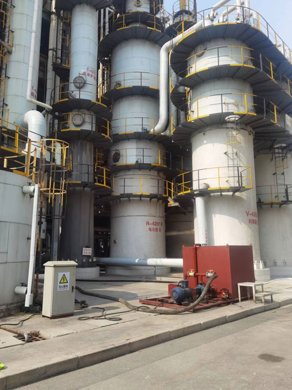 1.塔器設(shè)備噴淋清洗:噴淋清洗是一種循環(huán)清洗技術(shù),在清洗過程中,將化學(xué)清洗溶液均勻噴灑到所要清洗的系統(tǒng)內(nèi)表面上,借助清洗液的重力而沿容器壁流到底部,使清洗液與容器內(nèi)壁進行充分的接觸,發(fā)生化學(xué)反應(yīng)達到清潔系統(tǒng)的要求。通過調(diào)整噴淋頭的位置,可以使清洗液噴到容器頂以及容器內(nèi)壁,保證整個容器清洗的潔凈度。
